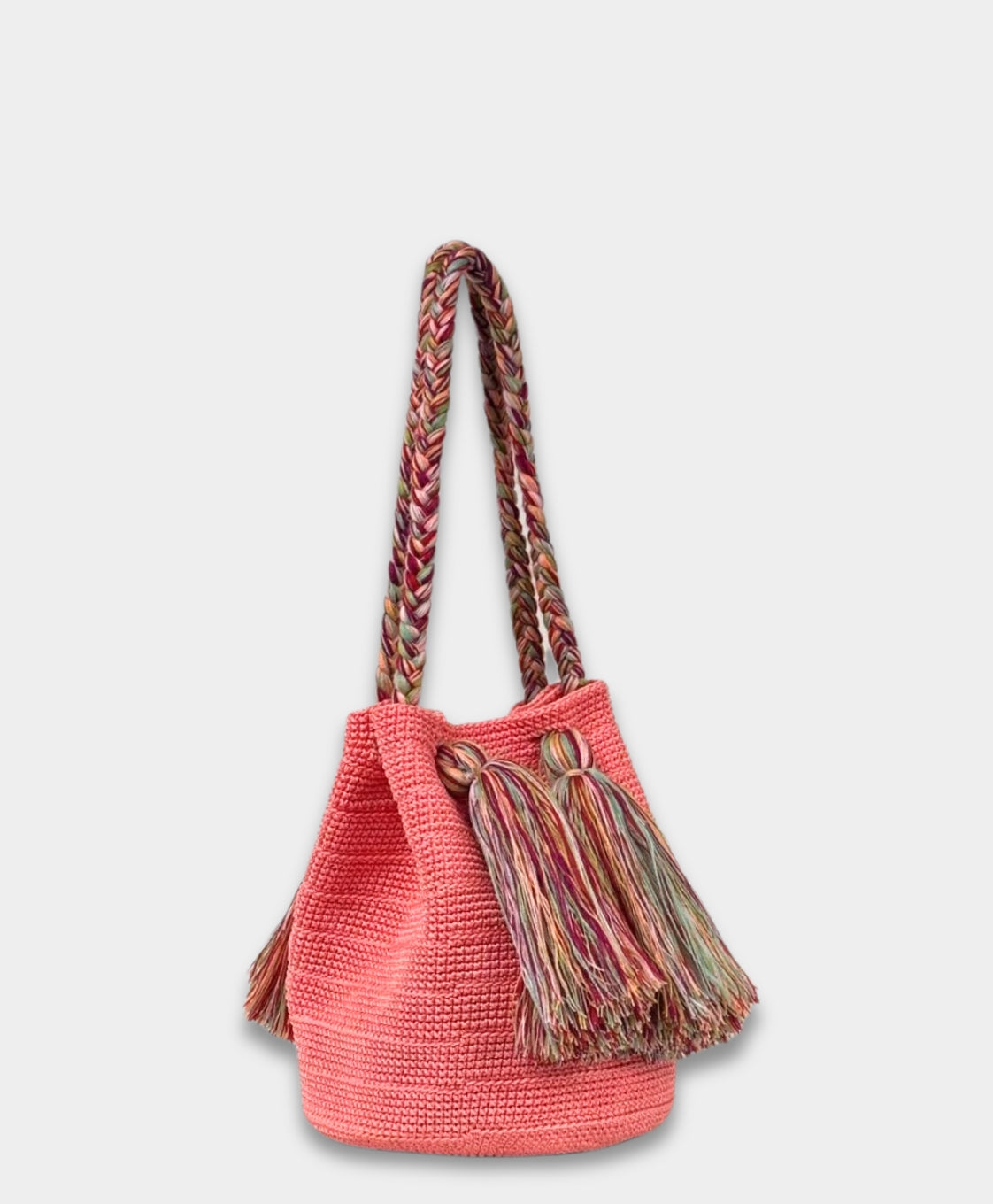 Blending tradition with modern style, this bucket-style design features bold, decorative tassels and sturdy braided straps. These distinctive accents add a playful yet sophisticated texture, making it a standout piece in any collection.