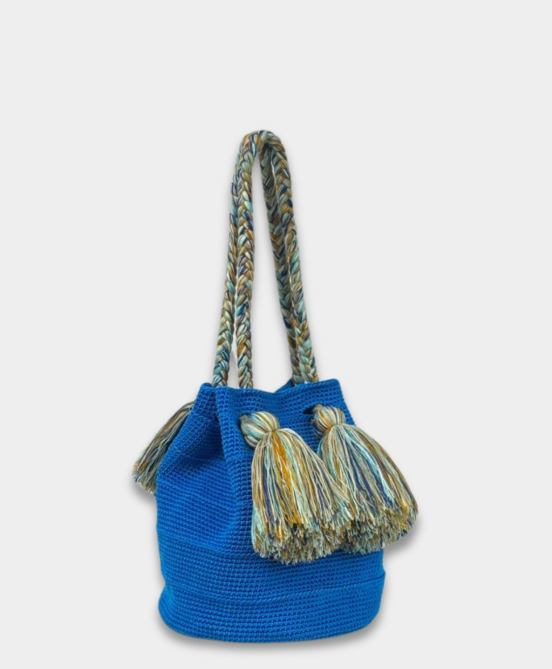 Blending tradition with modern style, this bucket-style design features bold, decorative tassels and sturdy braided straps. These distinctive accents add a playful yet sophisticated texture, making it a standout piece in any collection.